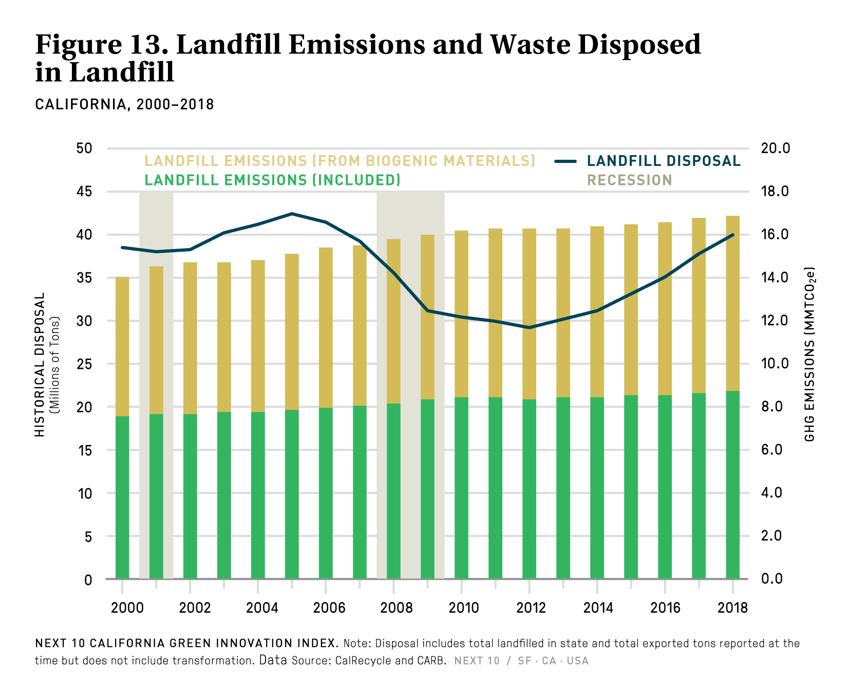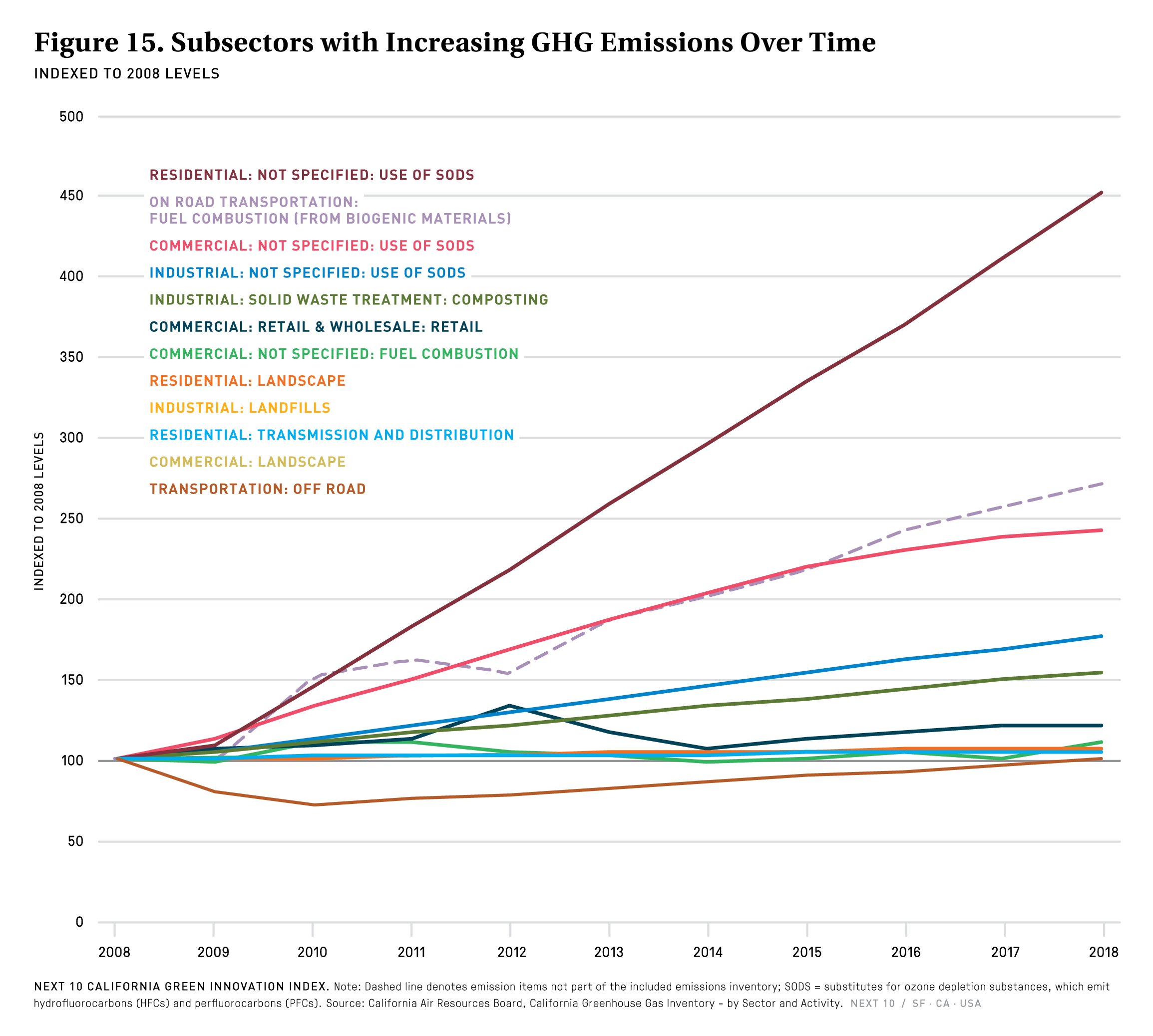 The 12th annual California Green Innovation Index finds that California's 2018 greenhouse gas emissions—the latest year for which data are available—rose overall for the first time since 2012, driven by increases in the power and commercial sectors. However, the report finds that California must now reduce its emissions by an average of 4.9 percent each year from 2020 to 2030 to cut emissions to 40 percent below 1990 levels by 2030, as mandated under SB 32. The largest one-year emissions drop California has ever achieved was at the height of the Great Recession in 2009, when climate pollution fell 6.1 percent. While 2020 may see a similar emissions drop, the state has never cut emissions more than 2.6 percent in a year while not experiencing an economic downturn since California passed AB 32 in 2006.