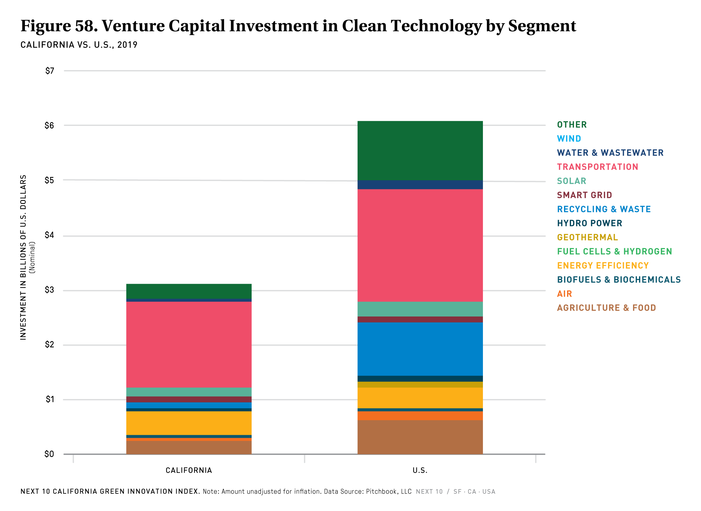 While ensuring adequate annual emissions reductions to meet the SB 32 goal by 2030 poses a challenge for the state, the report also finds that green stimulus for pandemic recovery could be California's best bet to gain ground. The report assessed the employment, labor income, and economic outputs expected from several green stimulus projects and finds that the state would greatly benefit from long-term funding for programs that produce local emissions reductions while spurring jobs and economic growth, rather than relying solely on cap-and-trade revenue for these projects, given budget shortfalls of 2020. Private sector investment can also drive green stimulus, and California captured 51 percent of the U.S.’ total $6 billion in clean tech venture capital investment in 2019, as large gains were made at companies that focus on geothermal, smart grid, and hydroelectric technologies.