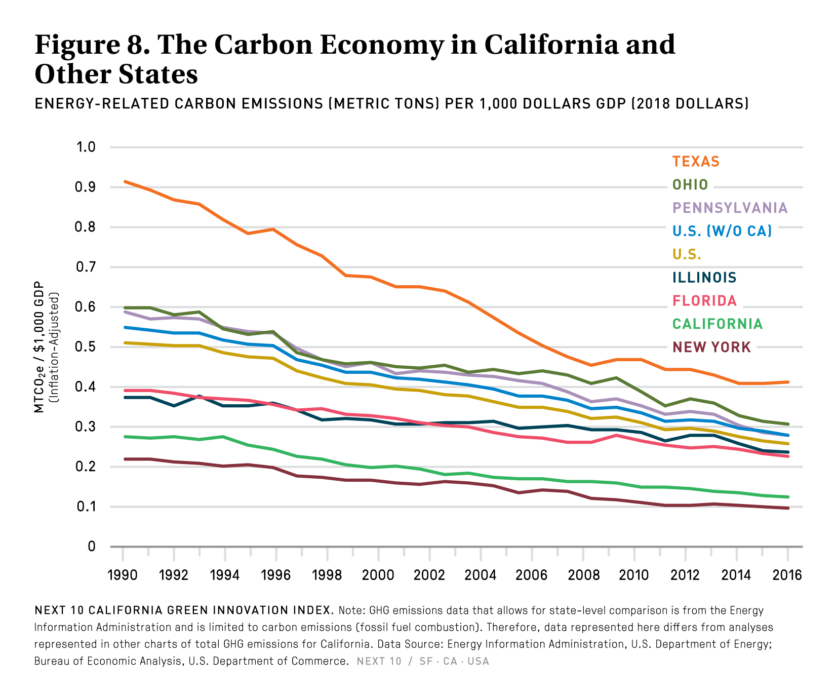 - Despite the slight increase in emissions of 0.2 percent, the state has managed to continue to reduce its carbon intensity—emissions relative to GDP—by 3.2 percent from 2017 to 2018 thanks to a strong growth in real GDP.