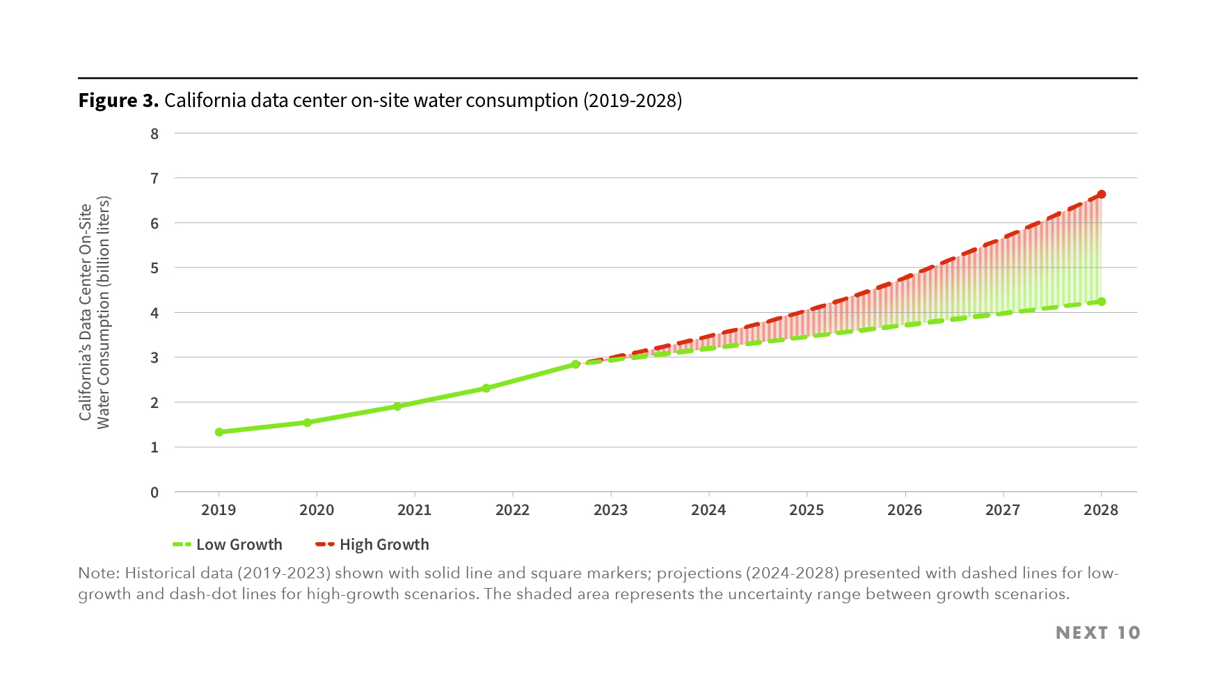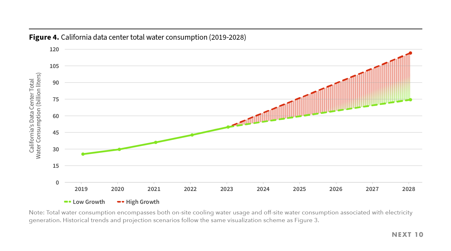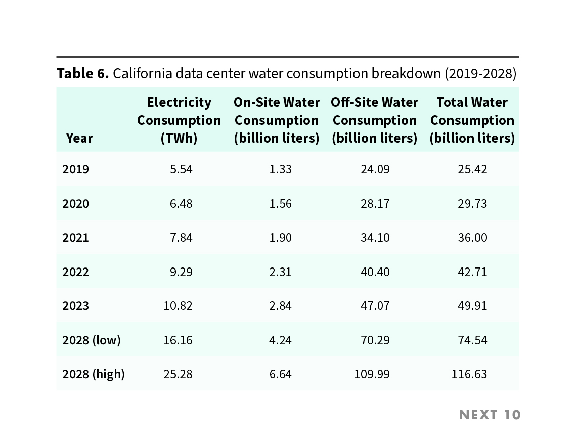 - Total water consumption by California data centers is projected to range from 74.54 to 116.63 billion liters by 2028, an increase of 193% to 358% compared to 2019.