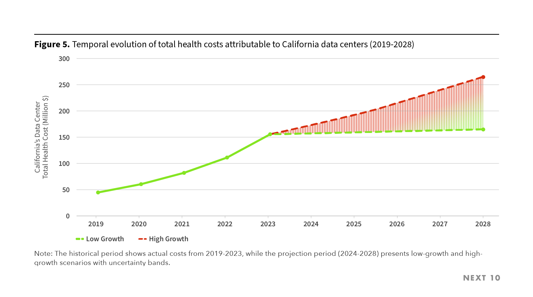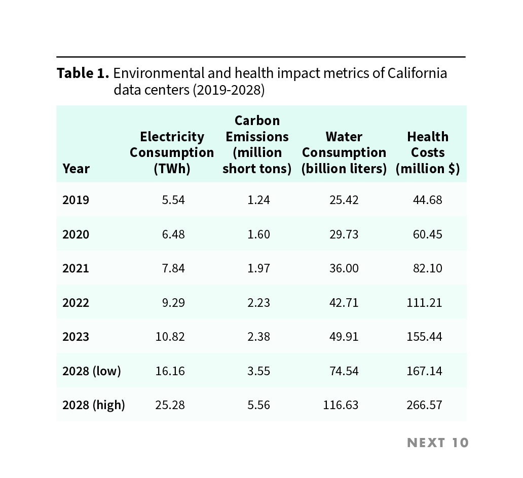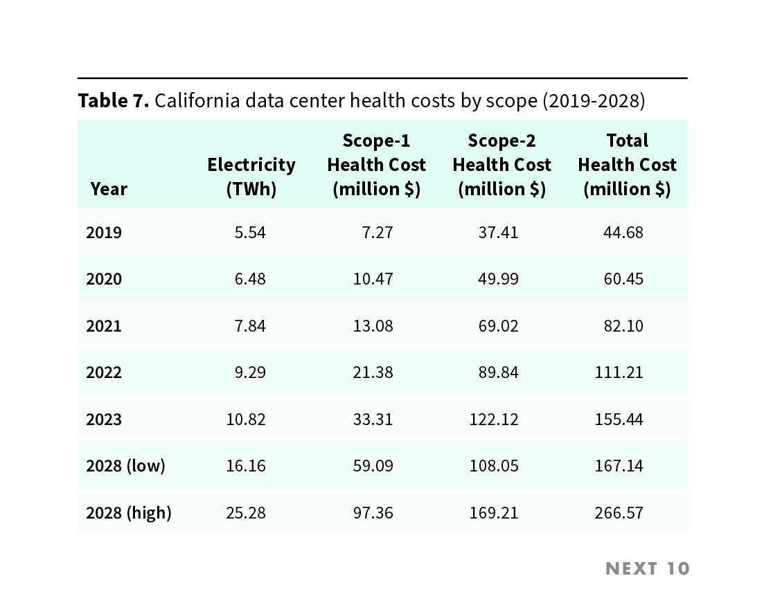 - By 2028, negative health impacts from data center pollution could add approximately 3,900 cases of asthma and 490 lost workdays to California, under the low-growth scenario.