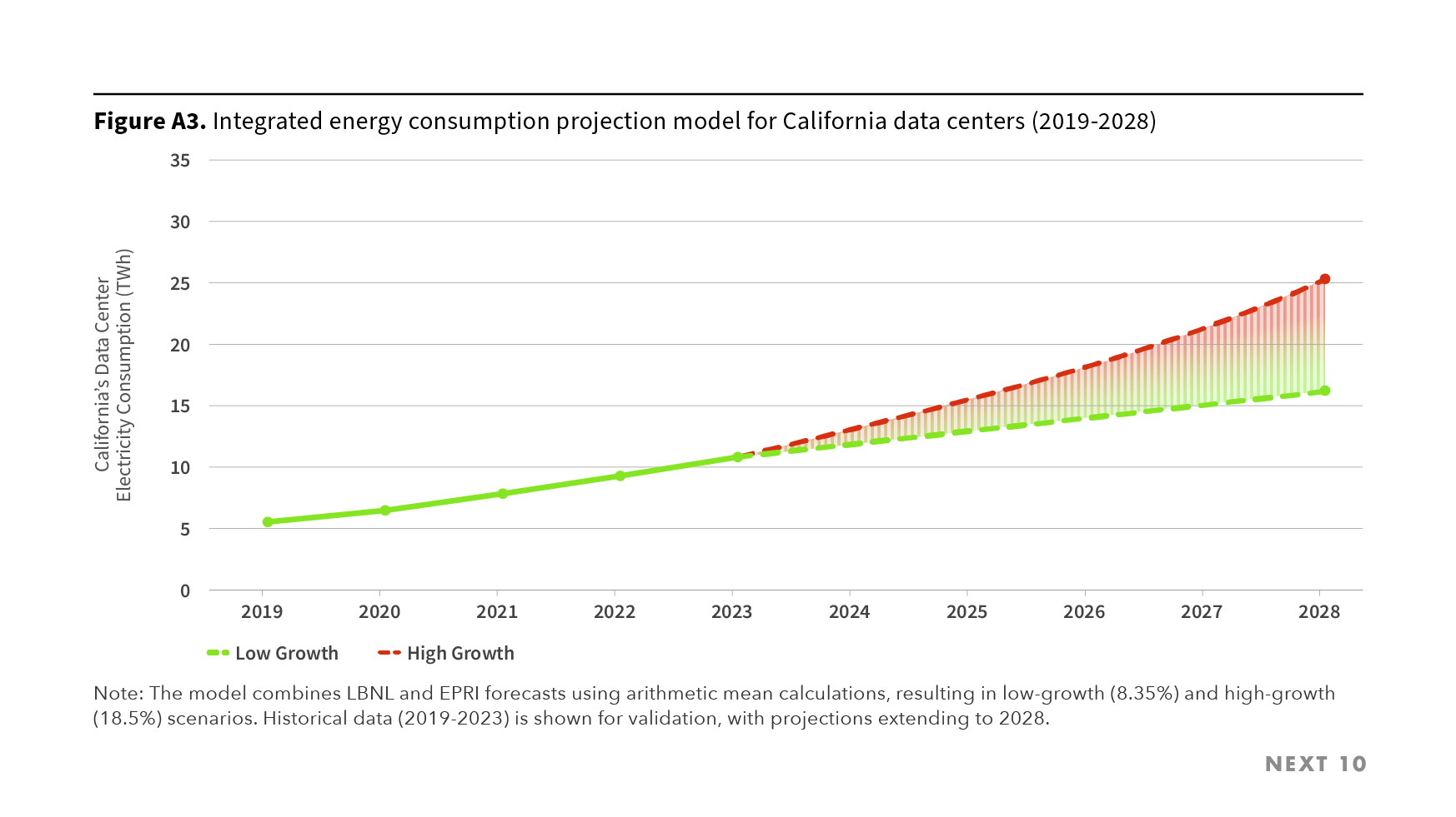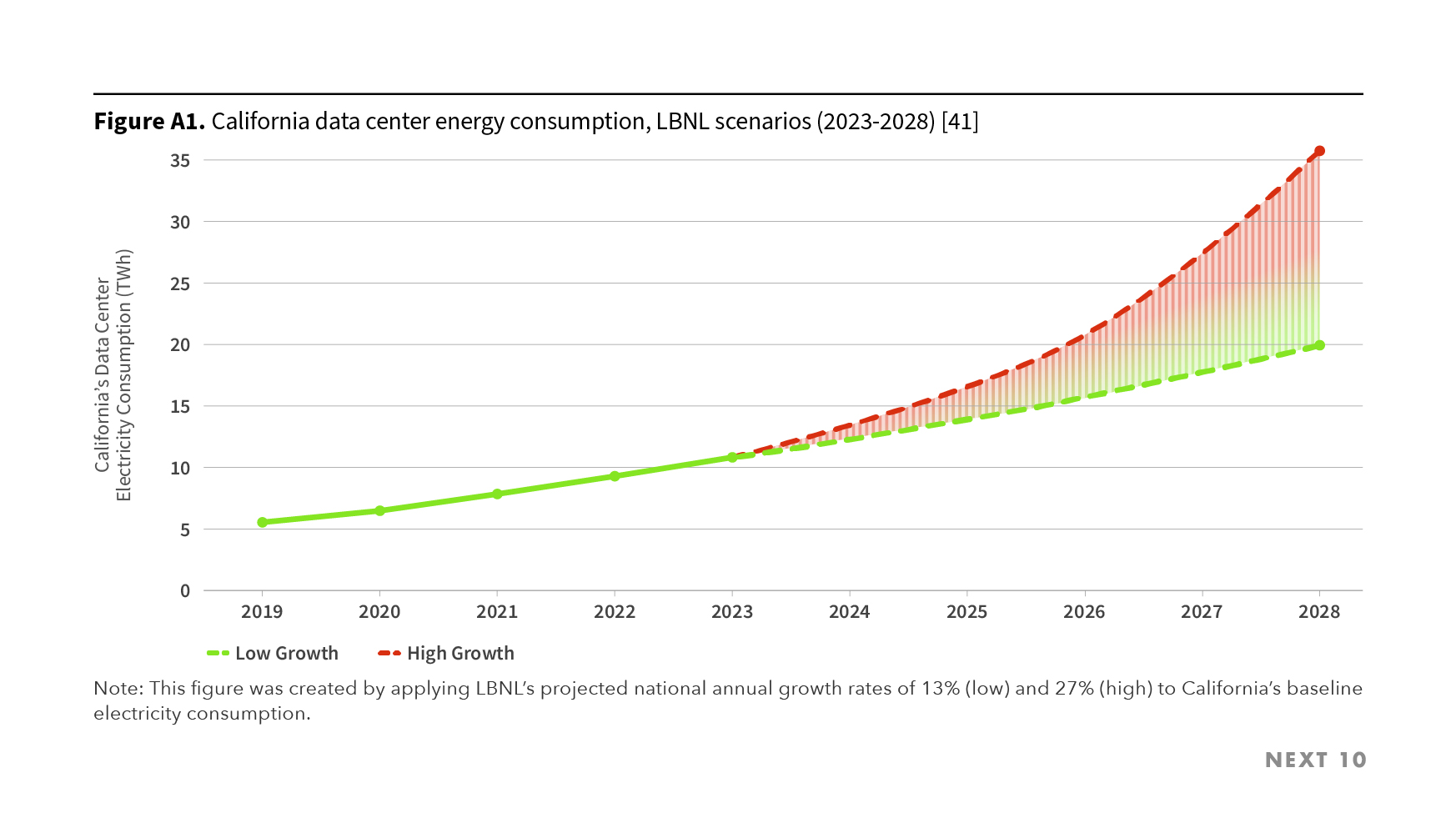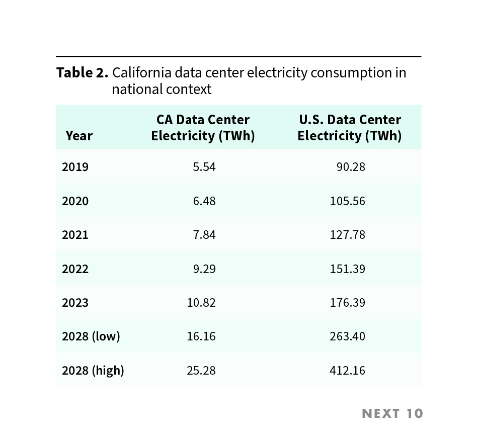 - The projections indicate that electricity consumption by data centers in California could grow to between 16.16 and 25.28 TWh by 2028 — which corresponds to an increase of 191.7% to 356% compared to 2019.