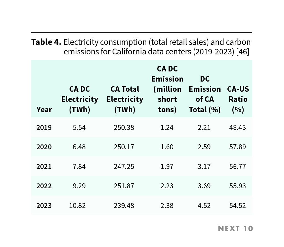 - From 2019 to 2023, the electricity consumption in California data centers increased from 5.54 TWh to 10.82 TWh, almost a 95% increase.