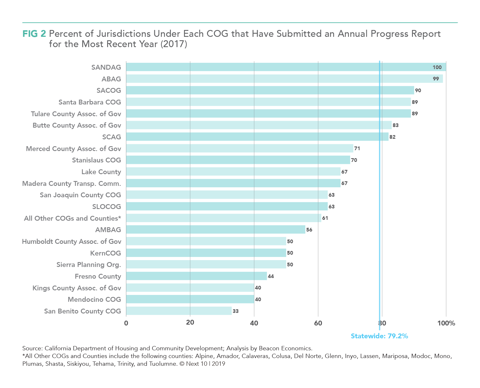 - San Diego Association of Governments (SANDAG) and Butte County Association of Governments are the only COGs where all jurisdictions have submitted an Annual Progress Report (APR) at least once since 2013.