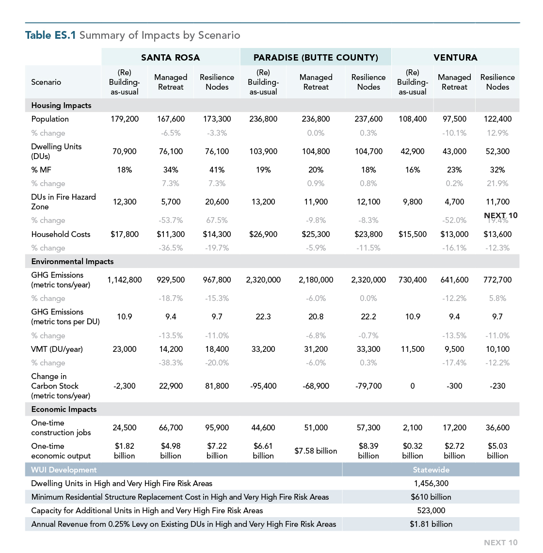 Researchers analyzed three rebuilding scenarios in line with each community's physical and socioeconomic characteristics and identified the economic, climate, workforce, future fire risk, and resident displacement impacts each of those scenarios were likely to have. The scenarios included: